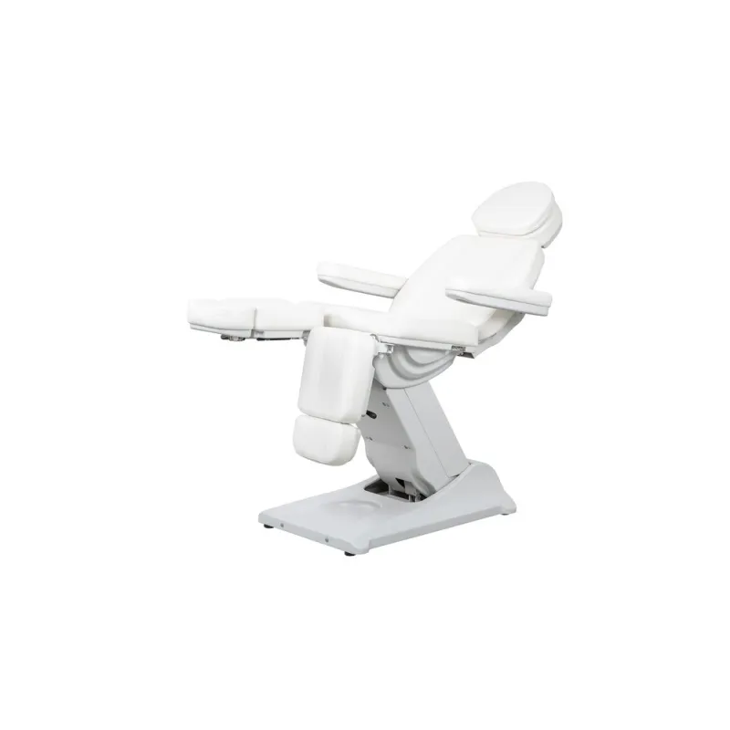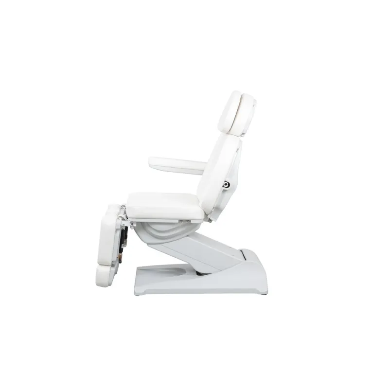 Sillón de podología equipado con 3 motores que controlan la altura, la inclinación del respaldo y del asiento. Reposapiés ajustables en altura independientemente mediante pistón de gas. Reposabrazos abatibles y reposacabezas regulable con agujero facial. Tapizado blanco en PU de alta calidad y fácil de limpiar.