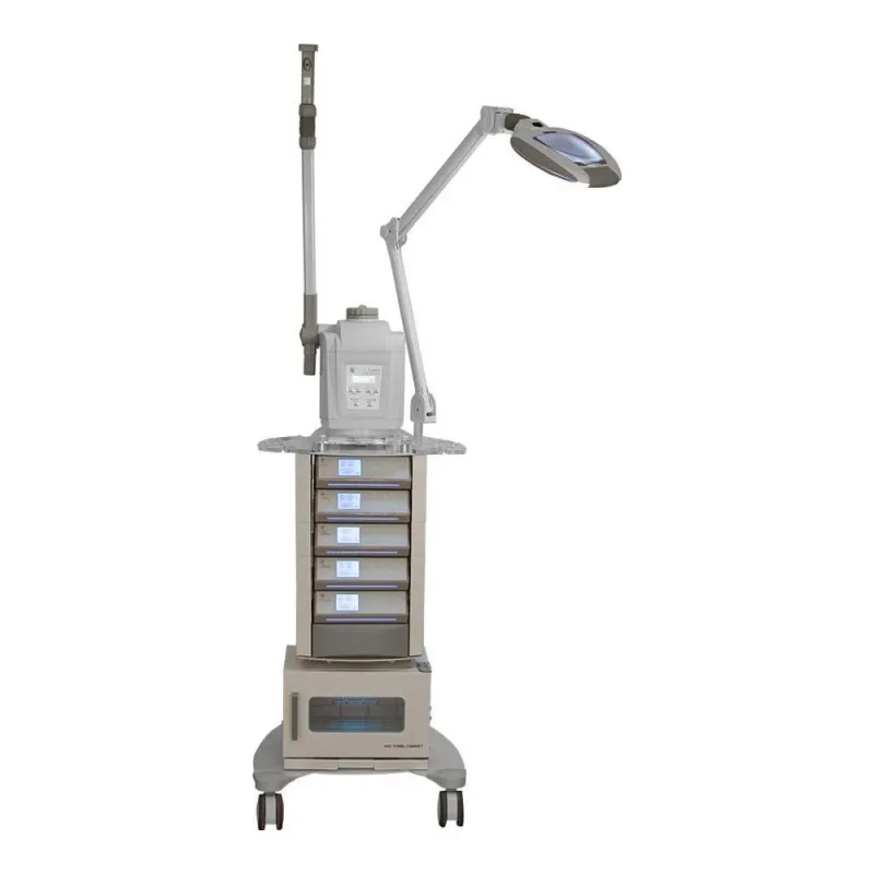 Torre multifunción para centros de estética, equipada de serie con lupa de 3 aumentos, vaporizador y calentador de toallas. Dispone de 6 alojamientos para añadir aparatos a elegir entre los 9 modelos de la serie B-Equipment. Base con ruedas para un fácil desplazamiento y máxima funcionalidad.