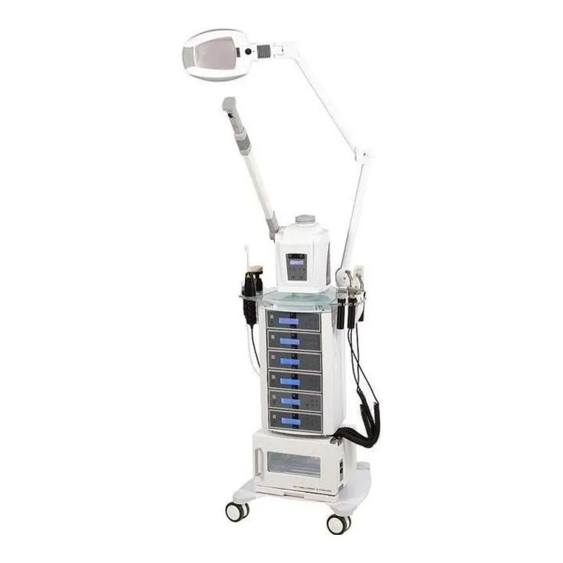 Torre multifunción para centros de estética, equipada de serie con lupa de 3 aumentos, vaporizador y calentador de toallas. Dispone de 6 alojamientos para añadir aparatos a elegir entre los 9 modelos de la serie B-Equipment. Base con ruedas para un fácil desplazamiento y máxima funcionalidad.