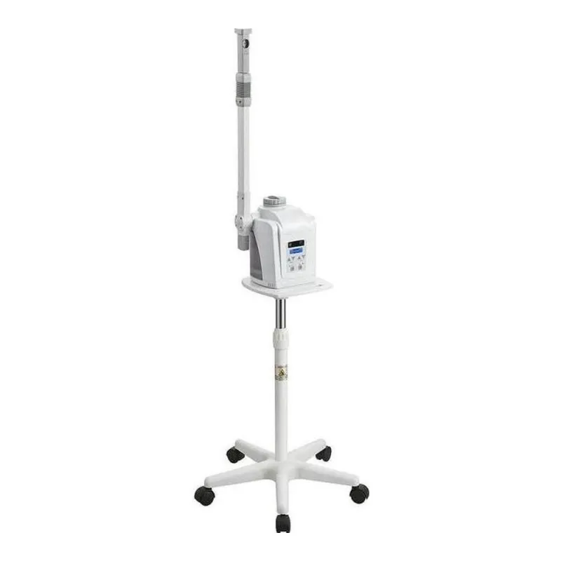 Vaporizador digital de alta gama con función ozono, brazo rotativo y cabezal orientable con receptáculo para esencias. Altura regulable y base con ruedas para un uso cómodo y profesional. Capacidad de 1,3 litros. Diseño moderno y funcional.