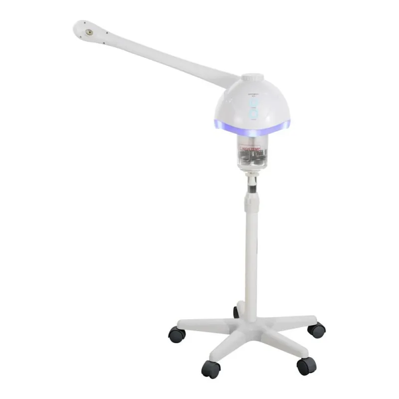 Vaporizador de ozono de diseño funcional y sencillo. Equipado con brazo pivotante y cabezal giratorio con un receptáculo de aceite aromático. Incluye un contenedor de hierbas en el depósito de agua. Ajustable en altura y base estable con ruedas para facilitar el movimiento.