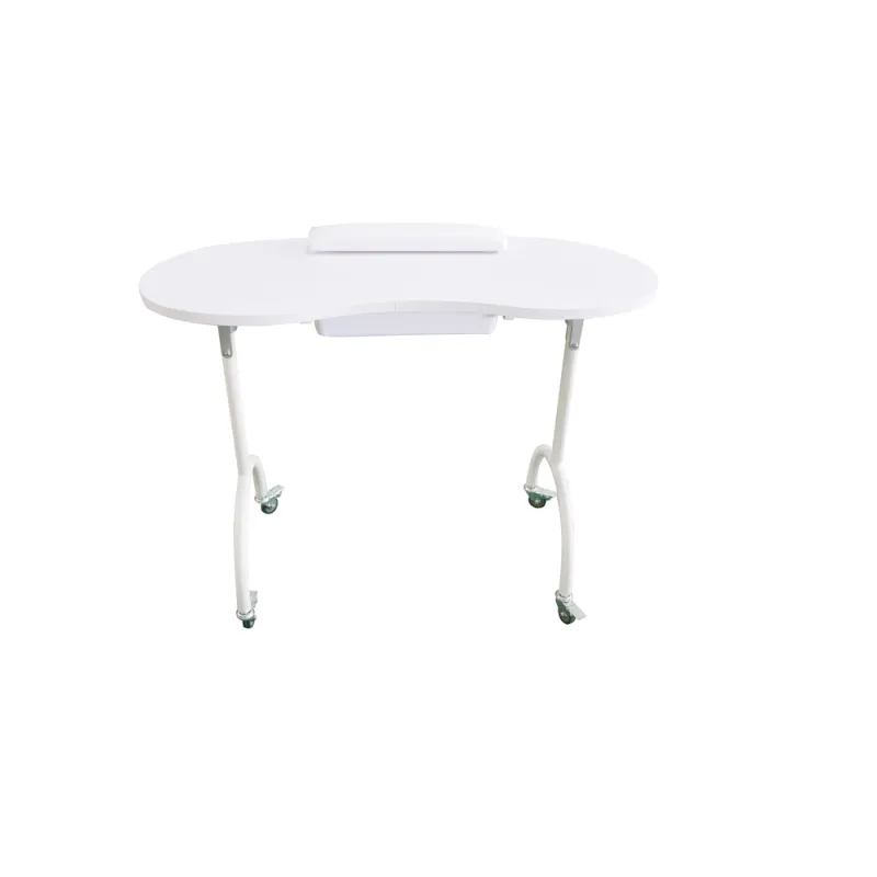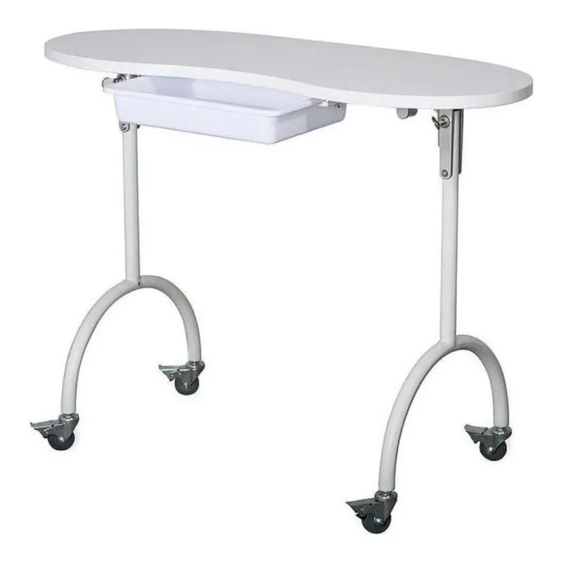 Mesa de manicura portátil y plegable equipada con un cajón bajo la superficie de trabajo, cojín reposamanos y dos ruedas con sistema de bloqueo. Bolsa de transporte incluida.