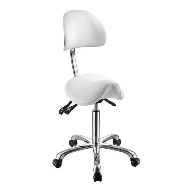 Taburete con respaldo envolvente de diseño ergonómico y elegante con asiento en forma de silla de montar que garantiza la máxima comodidad. Equipado con 3 palancas que permiten ajustar la altura, la inclinación del respaldo y del asiento mediante pistón de gas. Tapizado en PU blanco de alta calidad y base cromada con 5 ruedas muy estable.