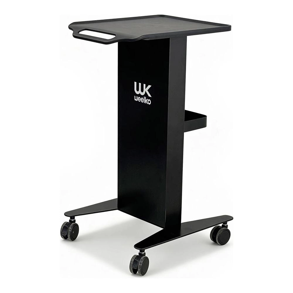 Carrito negro de metal de gran resistencia con un amplio estante superior especialmente diseñado para alojar equipos en salones de belleza y clínicas. También dispone de un estante inferior para un rápido acceso a otras herramientas de cuidado de la piel. Cuenta con 4 ruedas de suave deslizamiento y una asa superior para una movilidad total y sin esfuerzo.