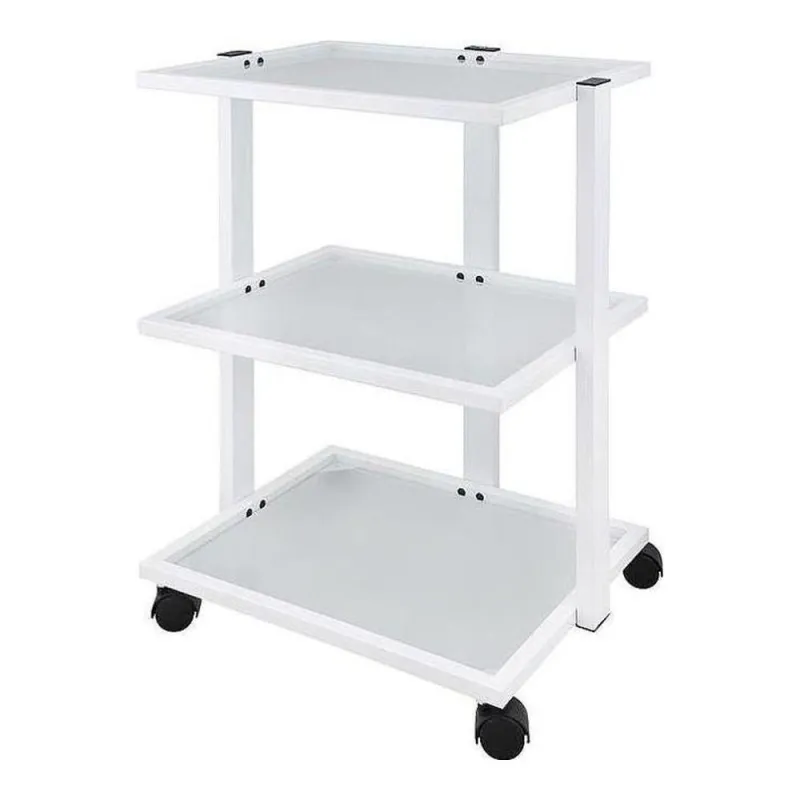 Carrito blanco metálico de diseño simple y práctico. Equipado con 3 amplios estantes de cristal translúcido para colocar instrumental. Total movilidad gracias a sus 4 ruedas.