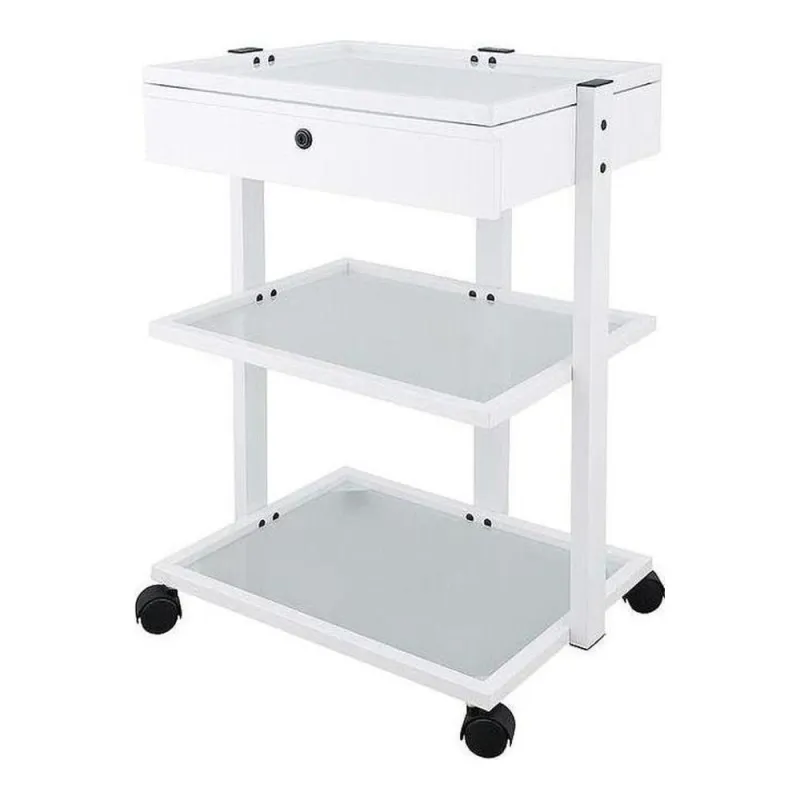 Carrito blanco metálico de diseño simple y práctico. Equipado con un cajón con llave y 2 amplios estantes de cristal translúcido para colocar instrumental. Total movilidad gracias a sus 4 ruedas.