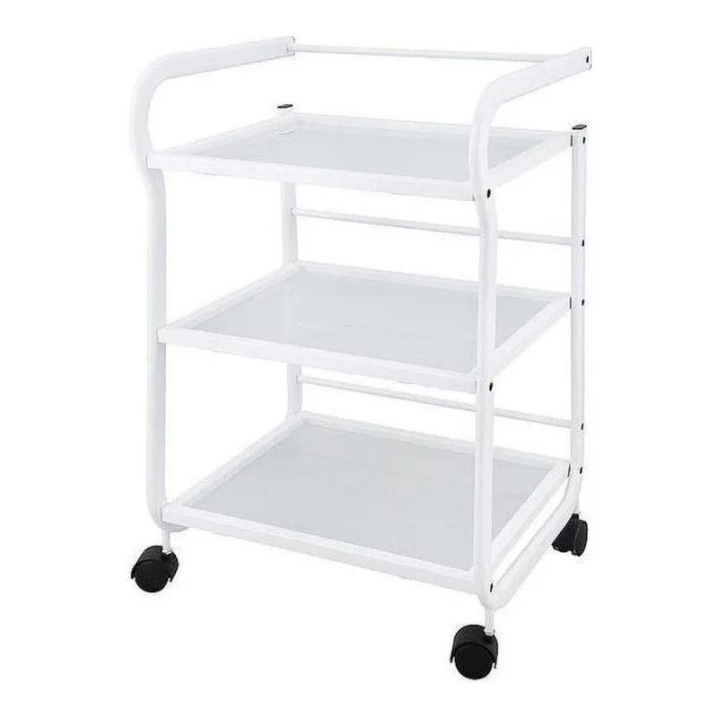 Carrito metálico blanco de diseño minimalista. Equipado con 3 amplios estantes de cristal translúcido. Total movilidad gracias a sus 4 ruedas y asa posterior.