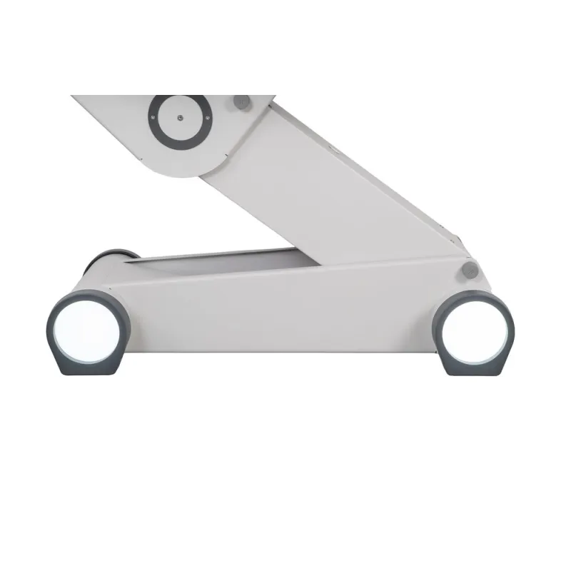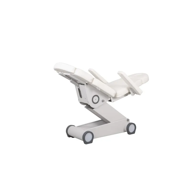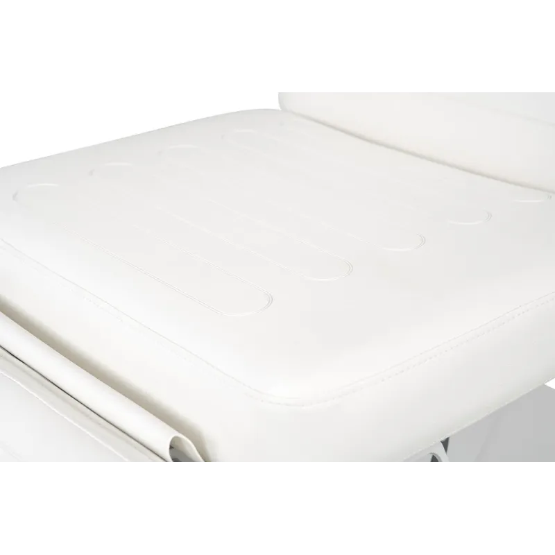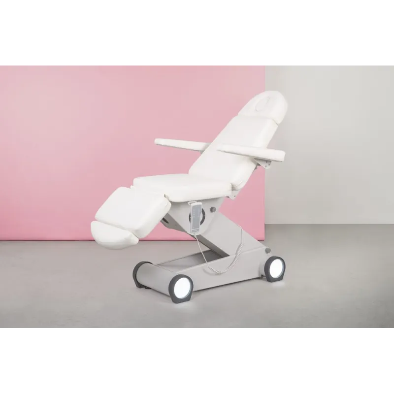 Fauteuil esthétique avec 4 moteurs pour des réglages précis, structure en acier et revêtement en polyuréthane blanc. Comprend une lumière LED intégrée, alliant confort, design moderne et entretien facile.