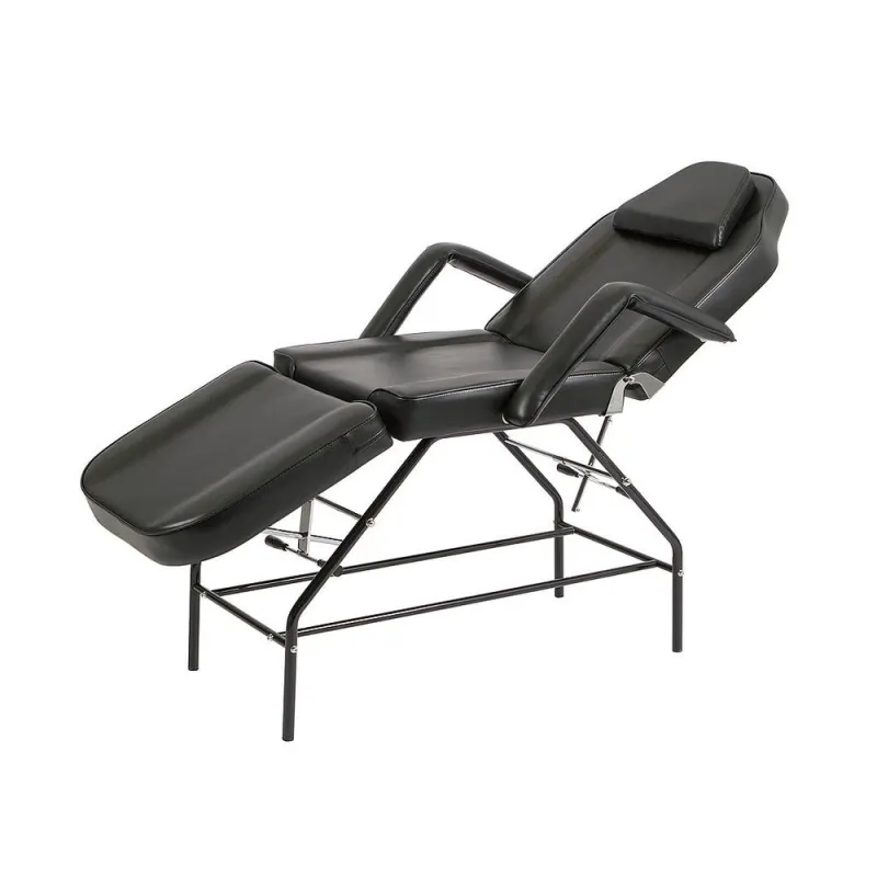 Table fixe à 3 sections avec structure métallique noire. L’inclinaison du dossier et du repose-pieds se règle manuellement. Accoudoirs et coussin têtière amovibles avec trou facial. Revêtement en PVC noir facile à nettoyer.