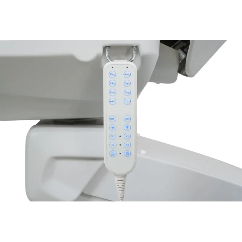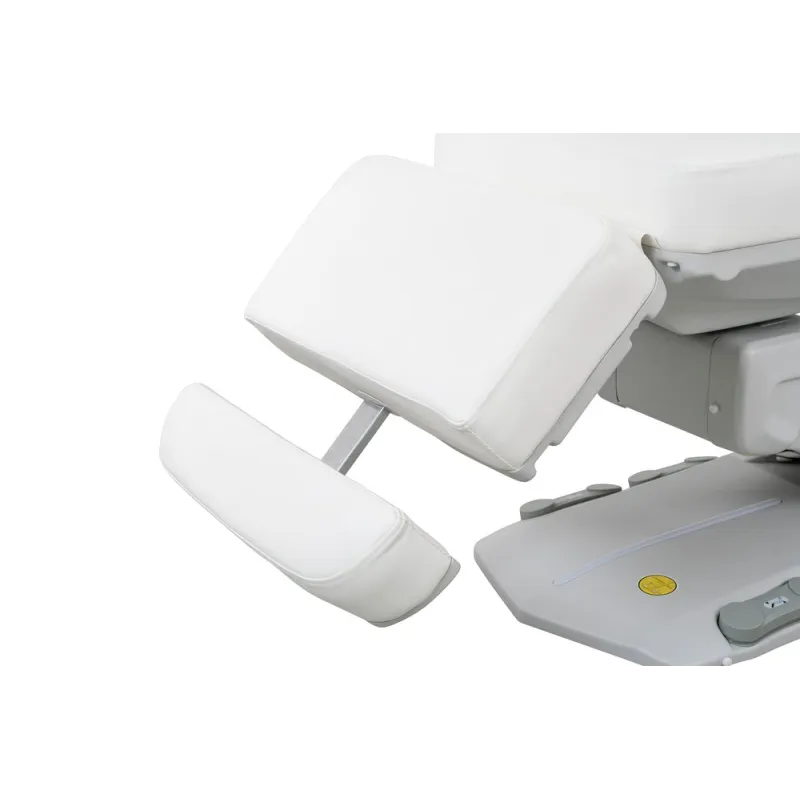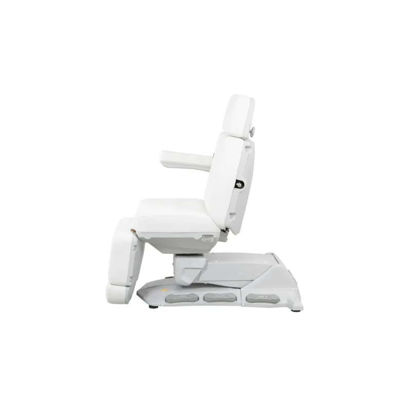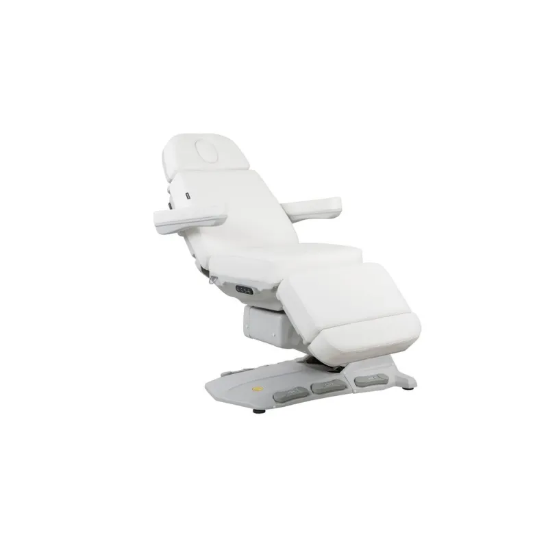 Table esthétique électrique haut de gamme avec fonction de chauffage et système de rotation, conçue pour offrir une polyvalence maximale dans les soins esthétiques, de bien-être et médicaux. Équipée de 4 moteurs réglant la hauteur, le dossier, l’assise et le repose-pieds. Rotation de 110°, accoudoirs rabattables, chauffage à deux niveaux de température et système de mémoire de positions. Revêtement en PU blanc de haute qualité, résistant et facile à nettoyer.