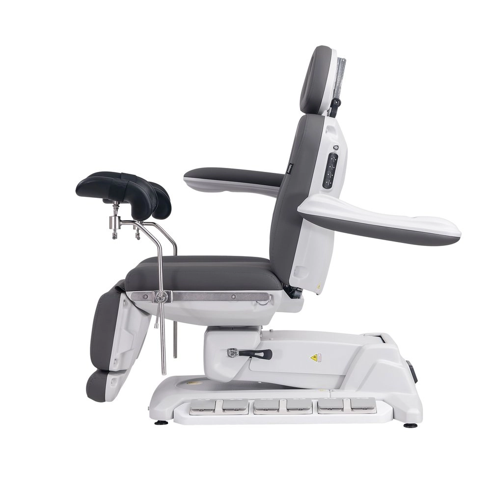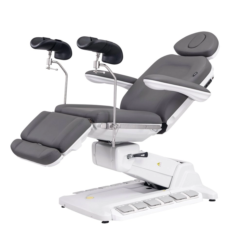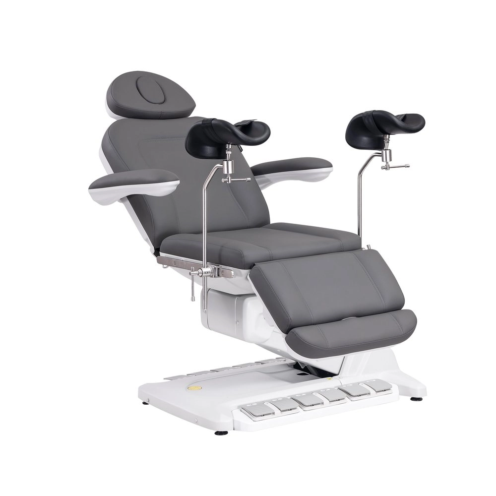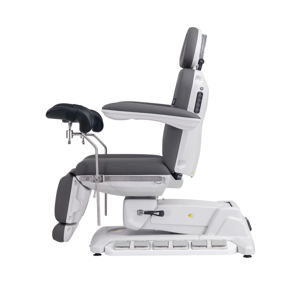 Fauteuil gynécologique électrique à 4 moteurs, revêtu en PU couleur gris, avec jambières gynécologiques.