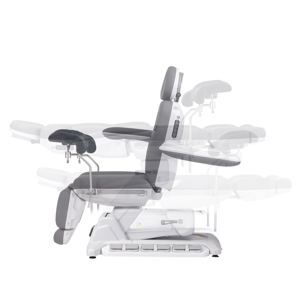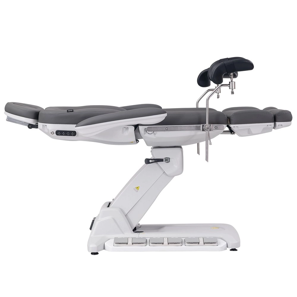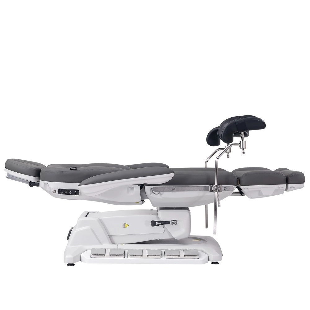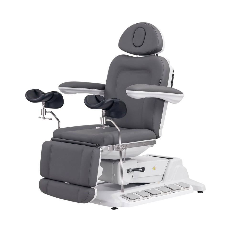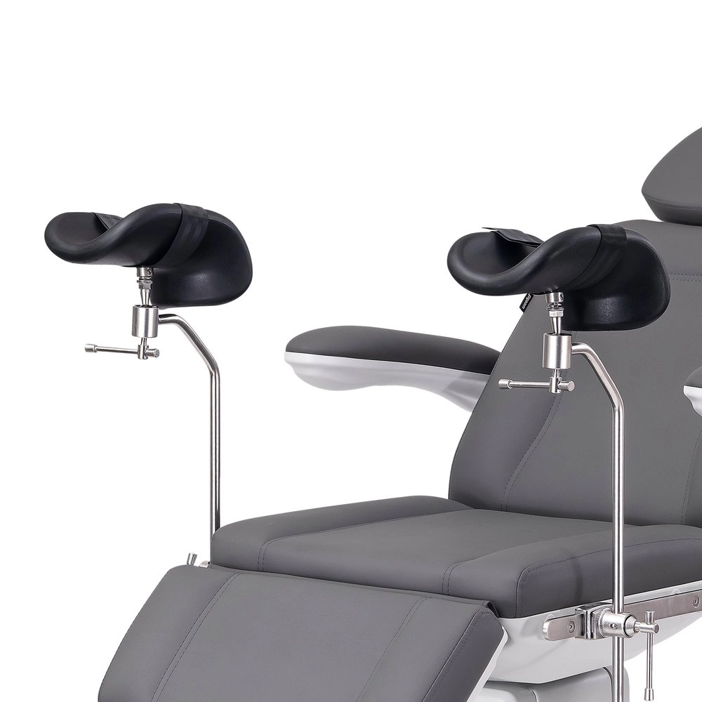 Fauteuil gynécologique électrique à 4 moteurs, revêtu en PU couleur gris, avec jambières gynécologiques.