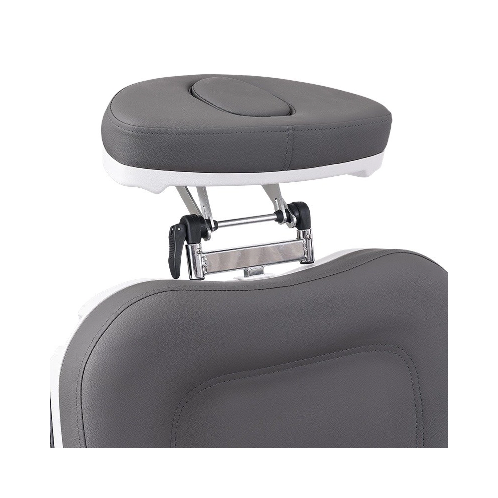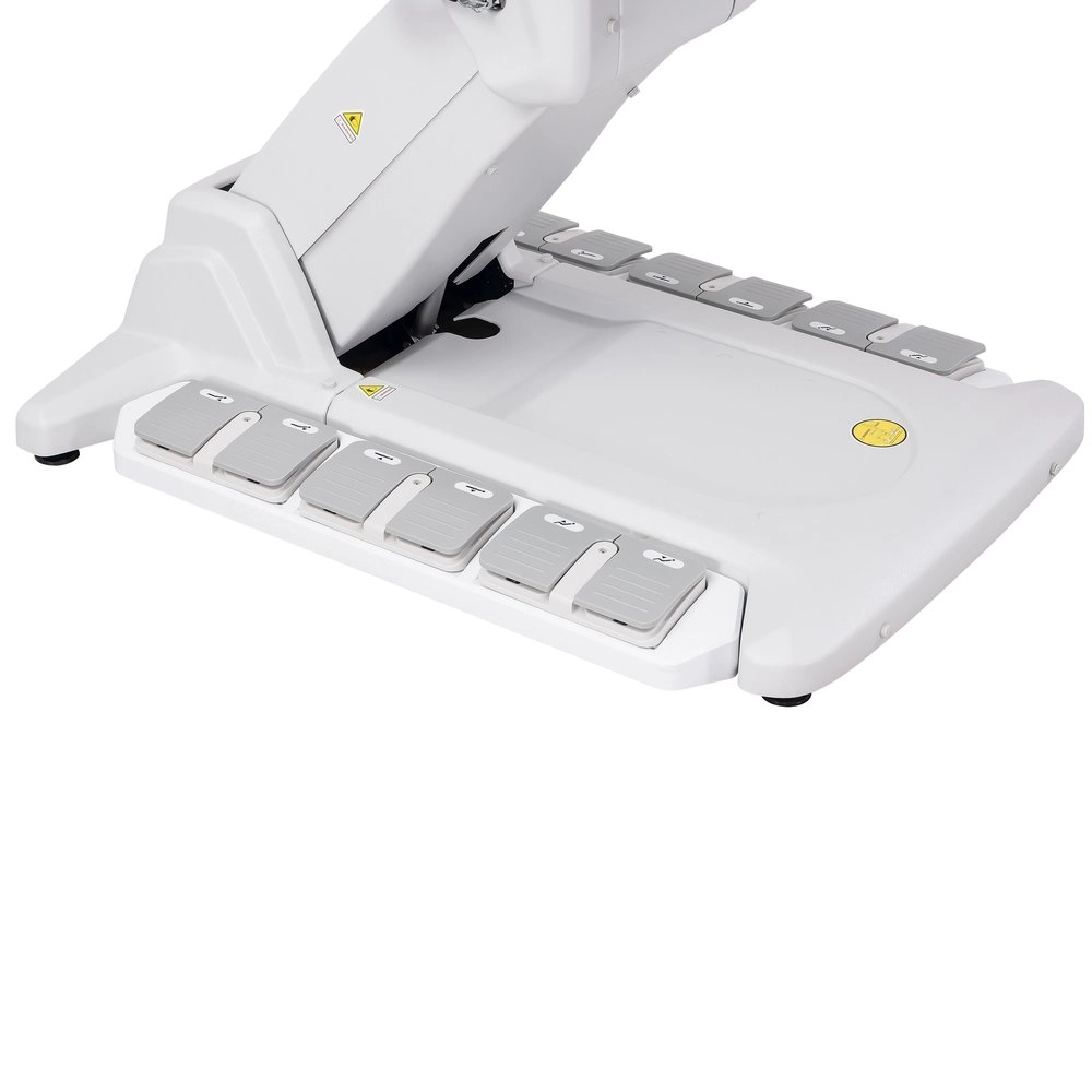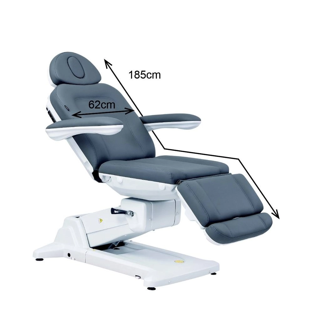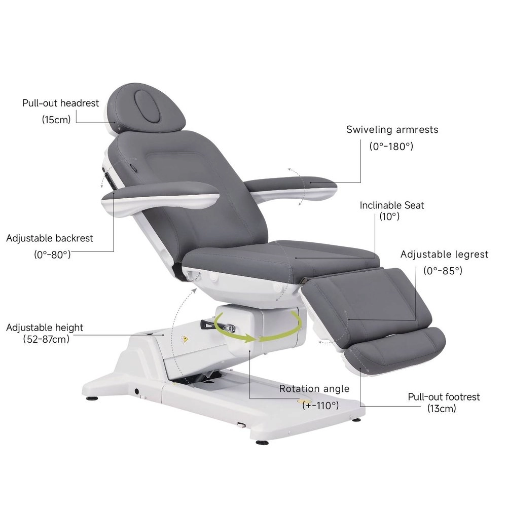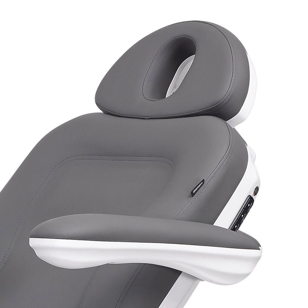 Réglage électrique de la hauteur, du dossier, du repose-pieds et de l'inclinaison, avec fonction Antigravité pour plus de confort lors des traitements longs. Équipé de jambières gynécologiques réglables qui s'adaptent aux besoins de chaque patient. Conçu pour optimiser l'espace de travail grâce à la rotation du fauteuil. Matelas en 3 sections avec extension pour la tête et les pieds, appuie-tête réglable en angle avec bouchon pour trou facial. Accoudoirs rabattables, amovibles et synchronisés avec le siège. Contrôle via télécommande manuelle et boutons intégrés, avec mémoires de position et fonction réinitialiser. Revêtement en PU, avec mousse haute densité et système de verrouillage intégral.
