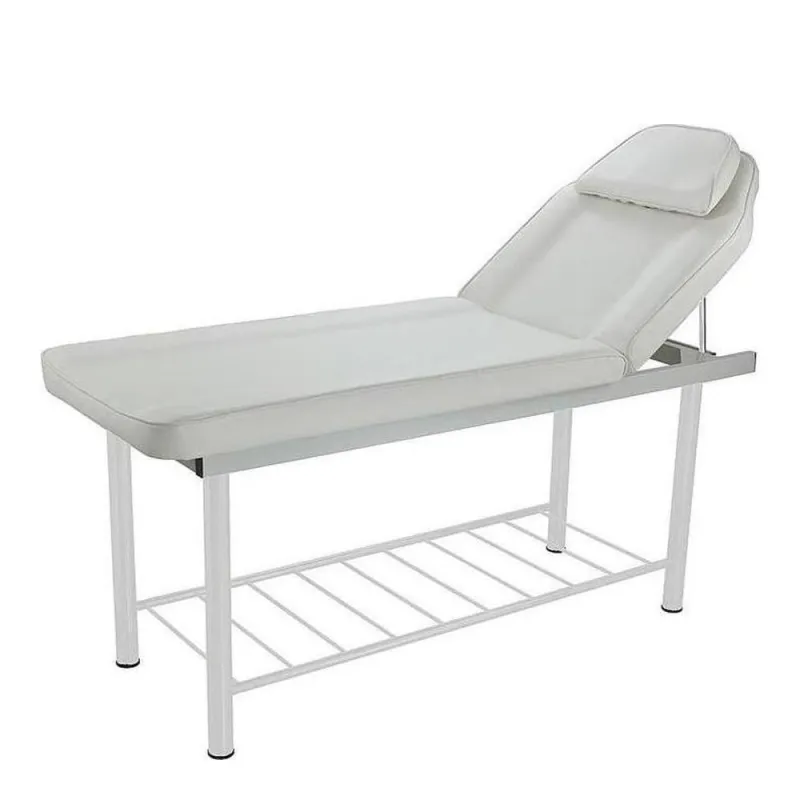 Table fixe à 2 sections avec structure métallique blanche. L’inclinaison du dossier est réglable manuellement. Coussin repose-tête amovible avec trou facial. Revêtement blanc en PVC facile à nettoyer.