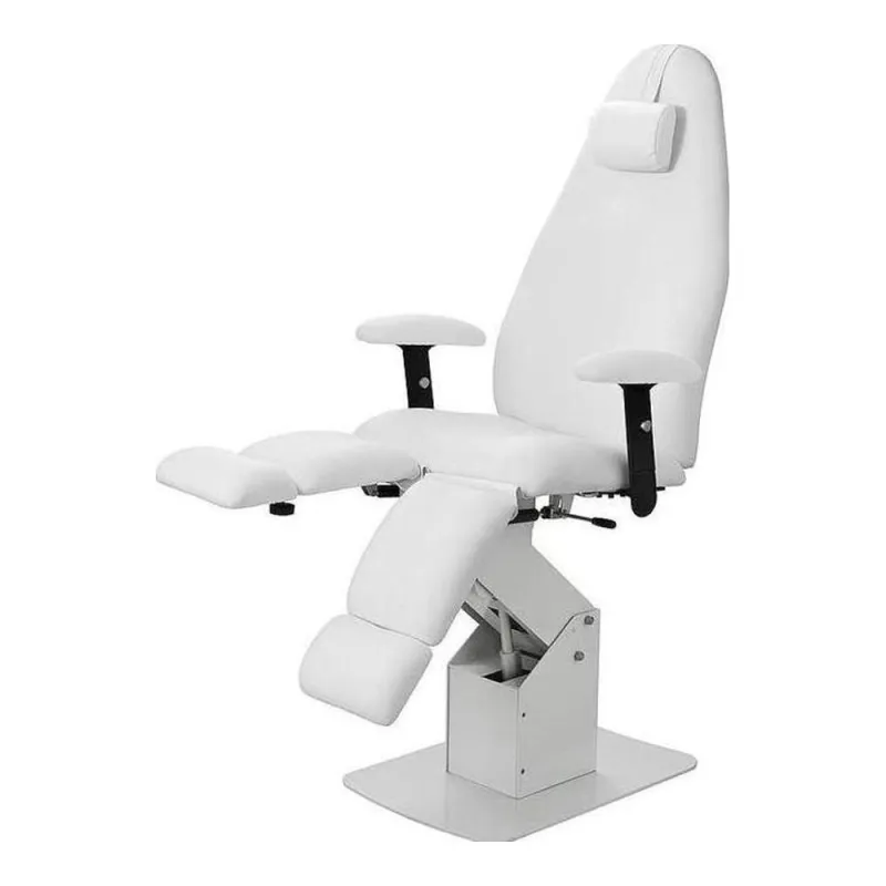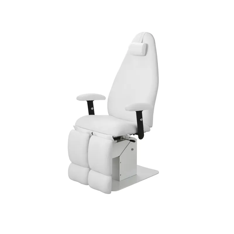Fauteuil de podologie au design minimaliste avec 1 moteur pour régler la hauteur. Dossier et repose-pieds réglables indépendamment grâce à un vérin à gaz. Coussin d’appui-tête amovible. Revêtement blanc en PU sans coutures de haute qualité, facile à nettoyer.