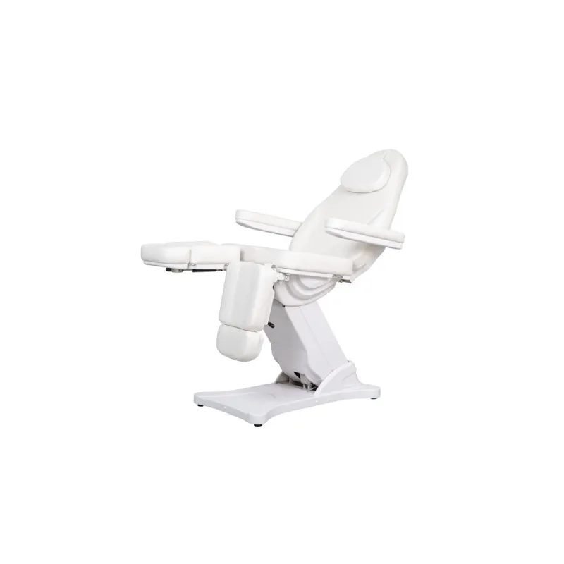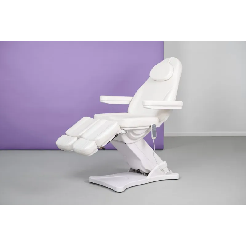 Fauteuil de podologie haut de gamme avec structure très stable, conçu pour offrir confort et fonctionnalité à chaque traitement. Équipé de 3 moteurs qui contrôlent la hauteur, l’inclinaison du dossier et de l’assise. Les repose-pieds sont réglables en hauteur de manière indépendante grâce à un vérin à gaz. Il dispose d'accoudoirs rabattables et d’un appui-tête réglable avec orifice facial. Revêtement en PU de haute qualité, disponible en blanc ou gris, facile à nettoyer. Option de chauffage pour un confort accru du patient.