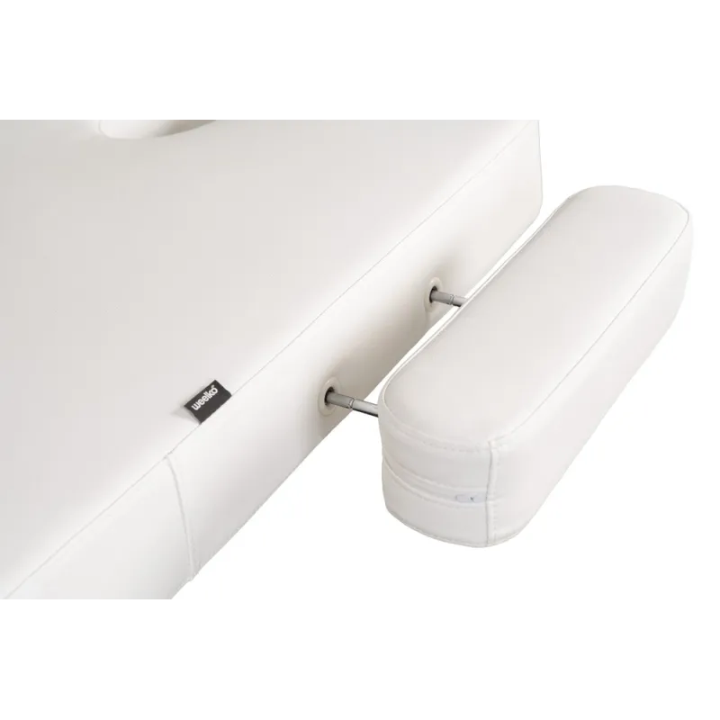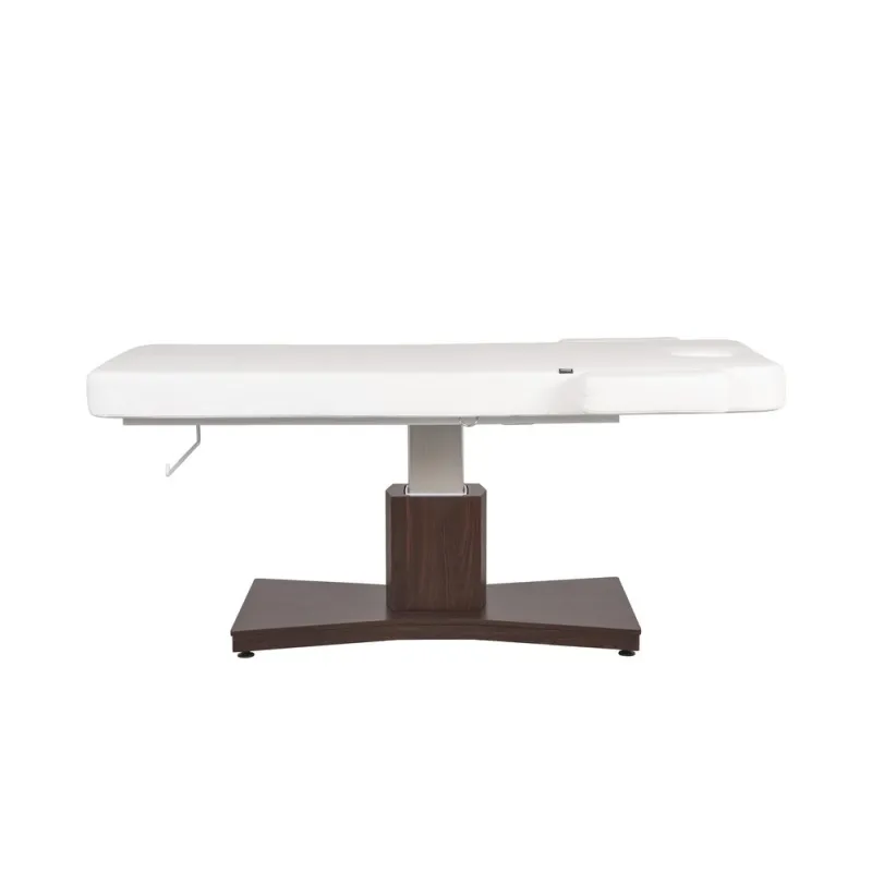 Table électrique multifonction avec base en bois. Un moteur règle la hauteur avec précision, tandis que le dossier s’ajuste manuellement grâce à un vérin à gaz. Comprend un coussin cervical avec ouverture faciale, des accoudoirs amovibles et un porte-rouleau inclus de série, offrant ergonomie et fonctionnalité premium pour spas et centres de beauté.