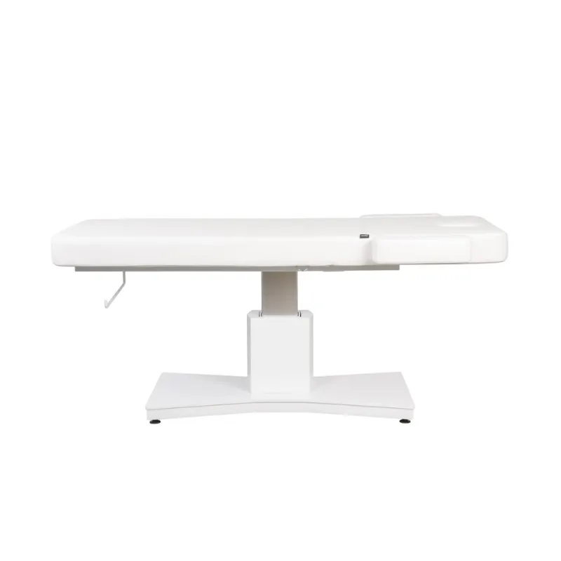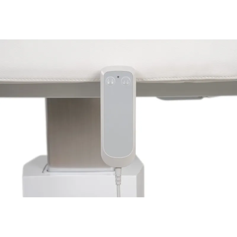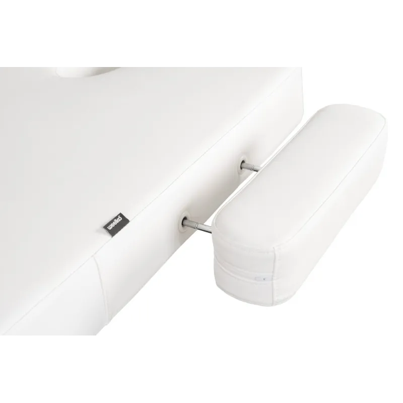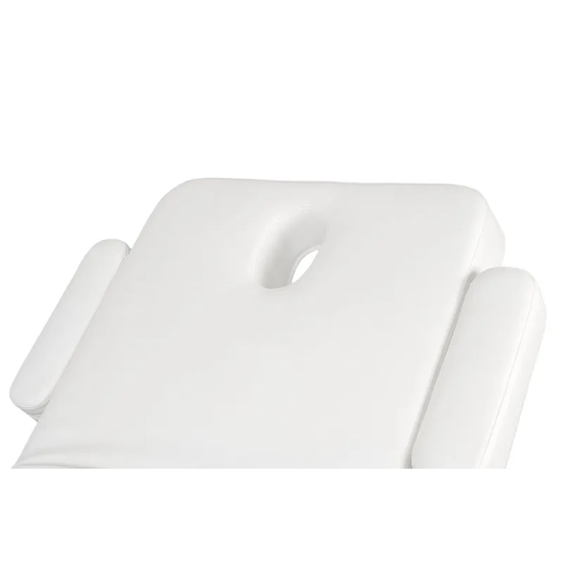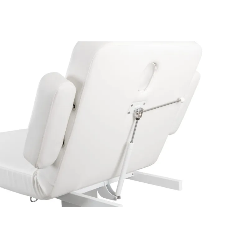 Table électrique multifonction avec base en bois. Un moteur règle la hauteur avec précision, tandis que le dossier s’ajuste manuellement grâce à un vérin à gaz. Comprend un coussin cervical avec ouverture faciale, des accoudoirs amovibles et un porte-rouleau inclus de série, offrant ergonomie et fonctionnalité premium pour spas et centres de beauté.
