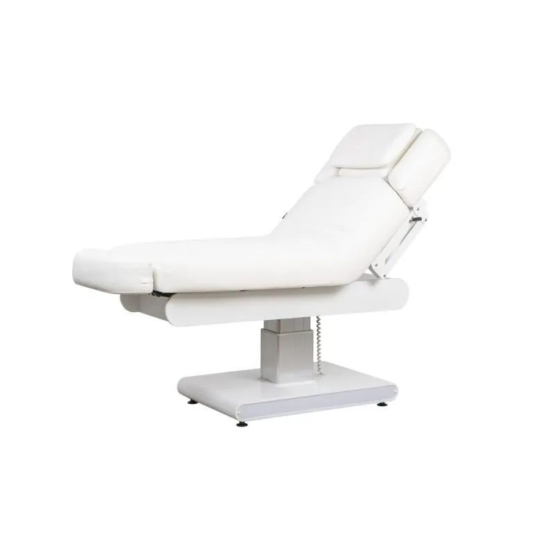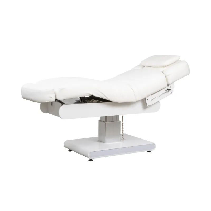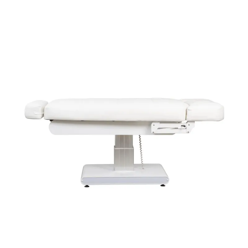 Table de SPA à 3 moteurs qui règlent la hauteur, l'inclinaison du dossier et du repose-jambes. Plus de 10 cm de rembourrage ultra confortable, revêtu de PU beige de haute qualité. Matelas monobloc divisé en 3 sections. Accoudoirs réglables et têtière avec trou facial. La base est dotée d’un système d’éclairage LED à couleurs interchangeables pouvant s’adapter à chaque centre.