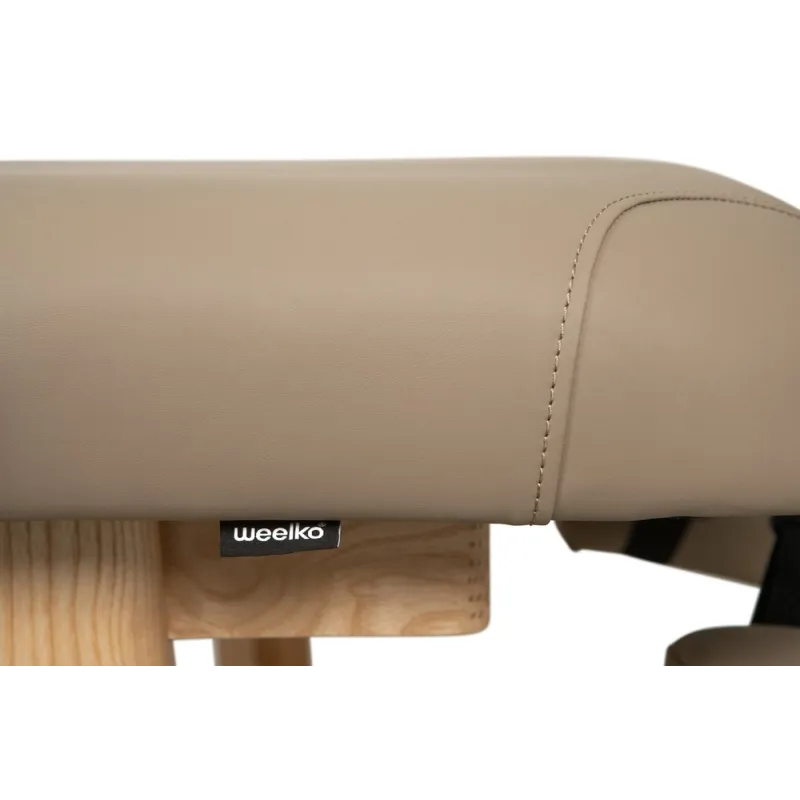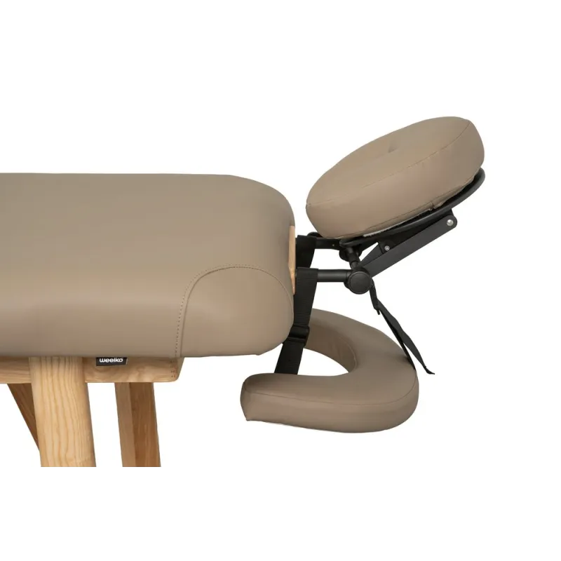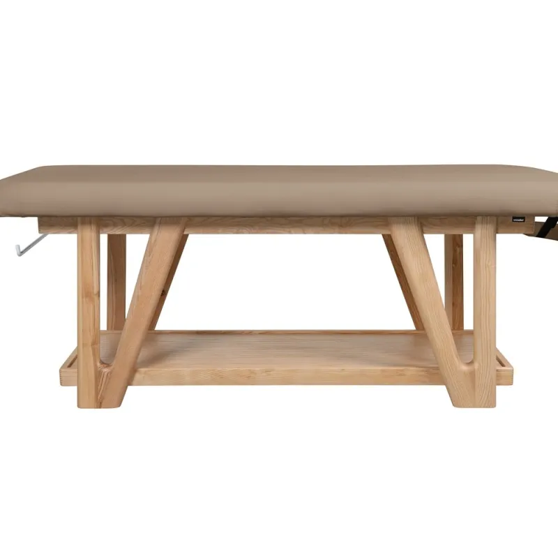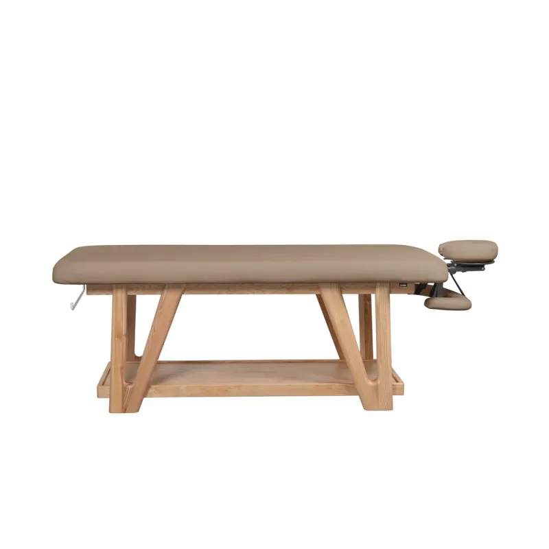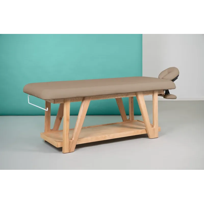 Table fixe en bois au design robuste et naturel, idéale pour les centres de massage, de bien-être et de soins corporels. Structure en bois massif avec étagère inférieure et porte-rouleau intégré. Comprend un matelas rembourré très confortable et une têtière réglable en hauteur, en inclinaison et en profondeur. Accoudoirs réglables pour un confort optimal du client. Revêtement en PU beige de haute qualité.