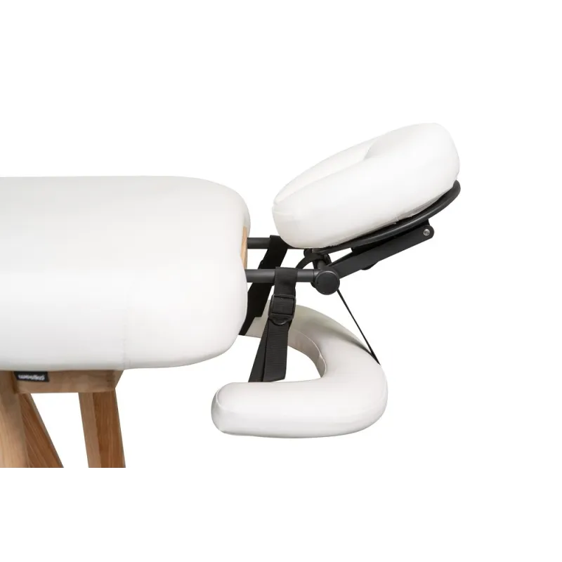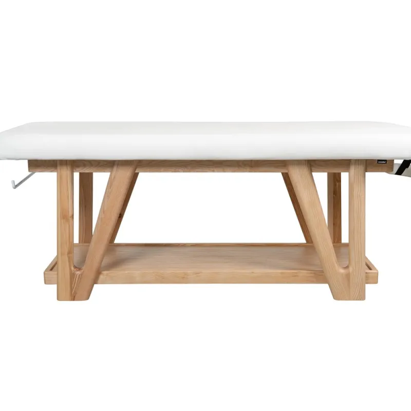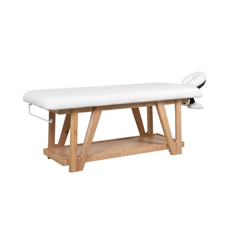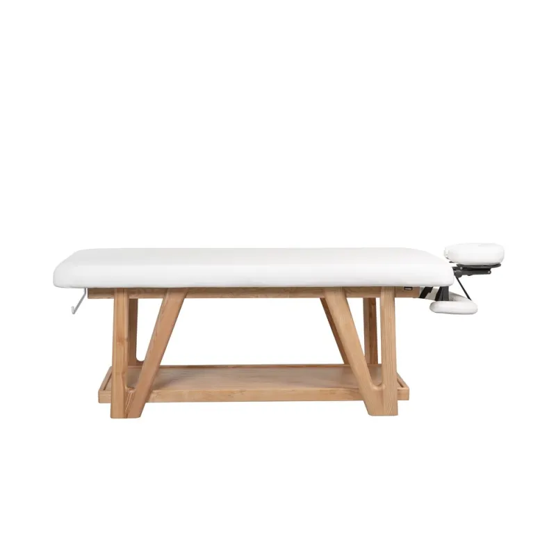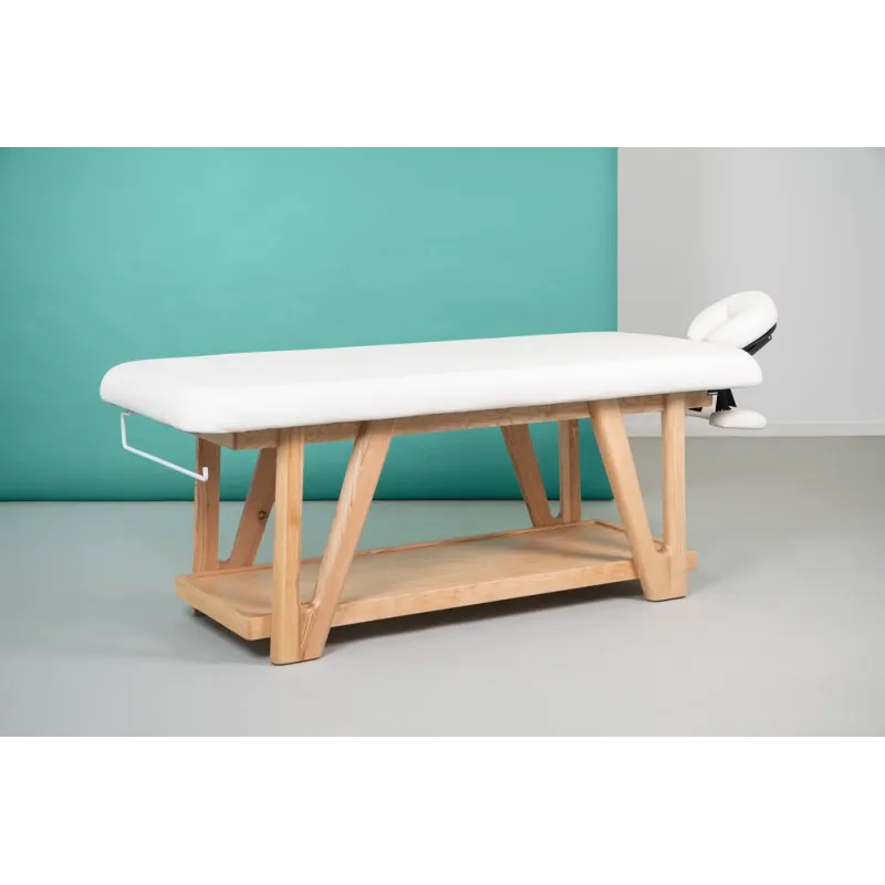 Table fixe en bois au design robuste et naturel, idéale pour les centres de massage, de bien-être et de soins corporels. Structure en bois massif avec étagère inférieure et porte-rouleau intégré. Comprend un matelas rembourré très confortable et une têtière réglable en hauteur, en inclinaison et en profondeur. Accoudoirs réglables pour un confort optimal du client. Revêtement en PU beige de haute qualité.