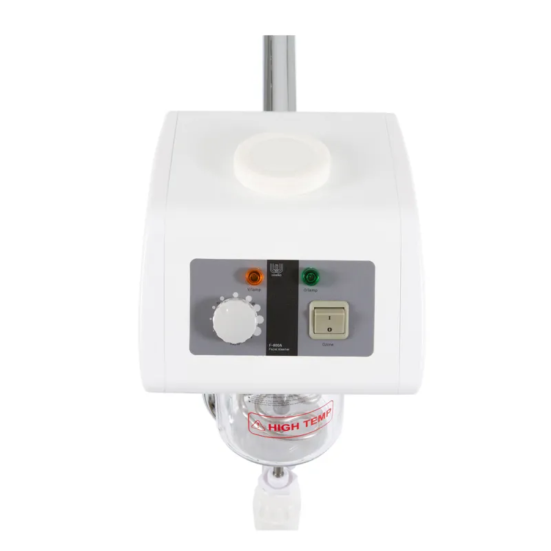 Vaporisateur à ozone avec boîtier métallique laqué blanc. Équipé d’une tête pivotante avec récipient pour essences. Hauteur réglable et base stable avec roulettes pour faciliter le déplacement.