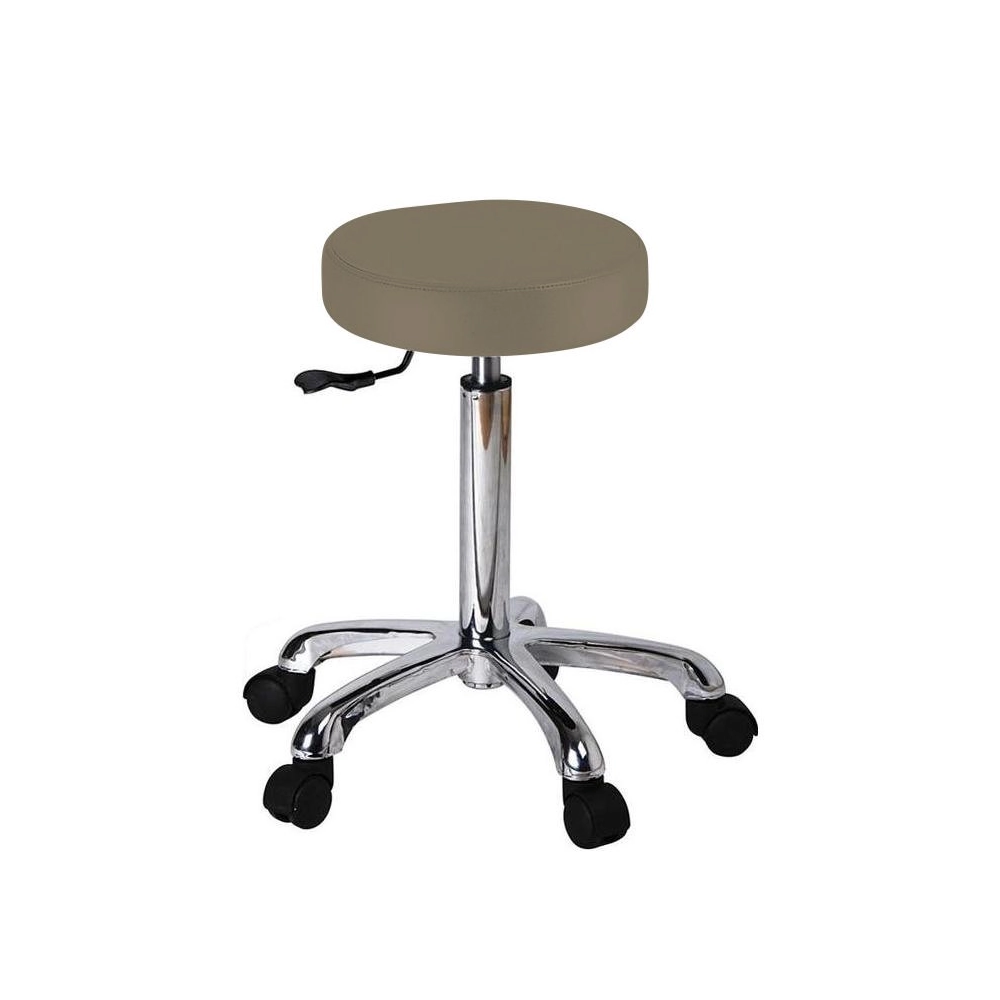 Tabouret pratique au design ergonomique. Assise plate et circulaire avec réglage de la hauteur par vérin à gaz. Revêtement en PU blanc de haute qualité et base chromée avec 5 roulettes.