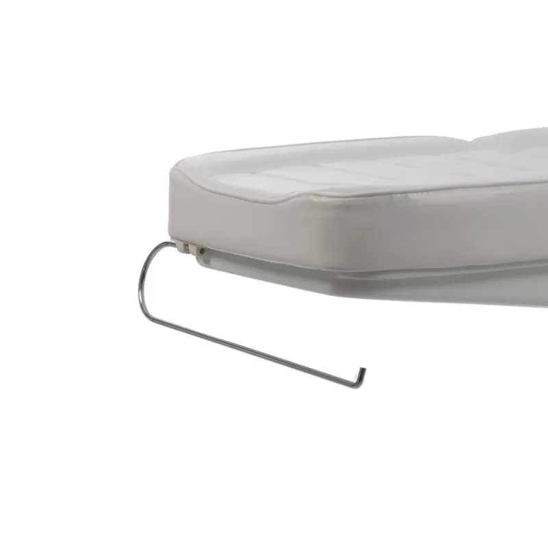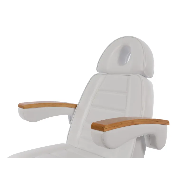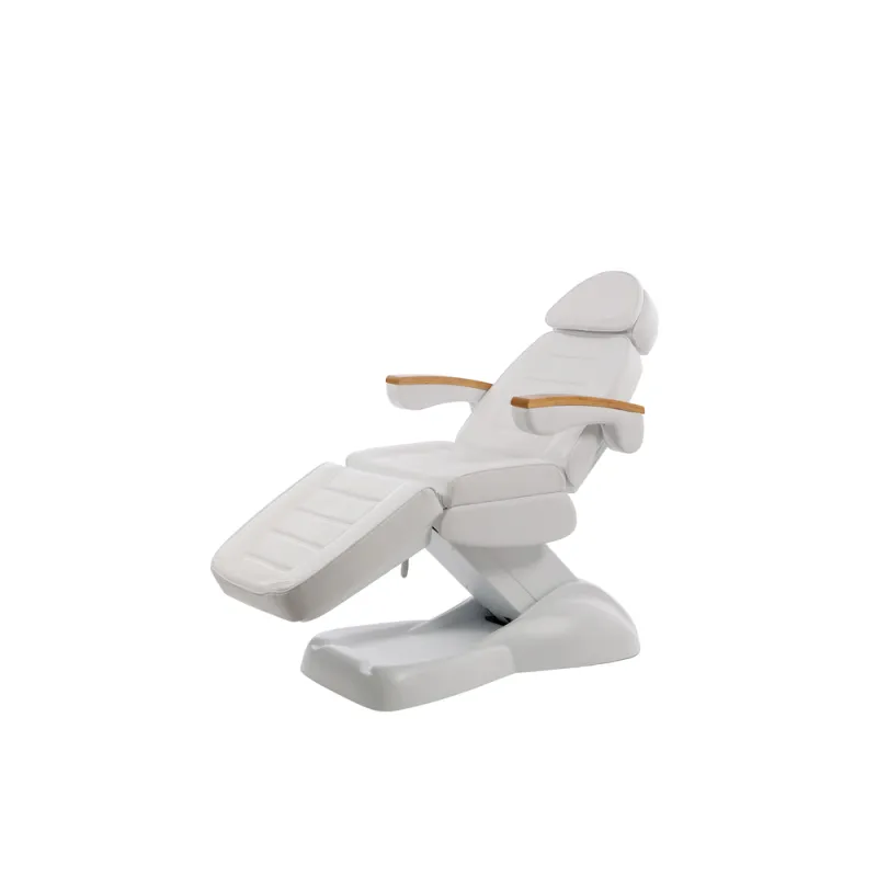 Poltrona estetica a 3 sezioni con 4 motori che controllano l’altezza, l’inclinazione della seduta, dello schienale e del poggiapiedi. Braccioli ribaltabili e poggiatesta regolabile con foro facciale. Disponibile anche con 3 motori (modello WKE014). Rivestimento bianco in PVC, facile da pulire. Portarotolo incluso.