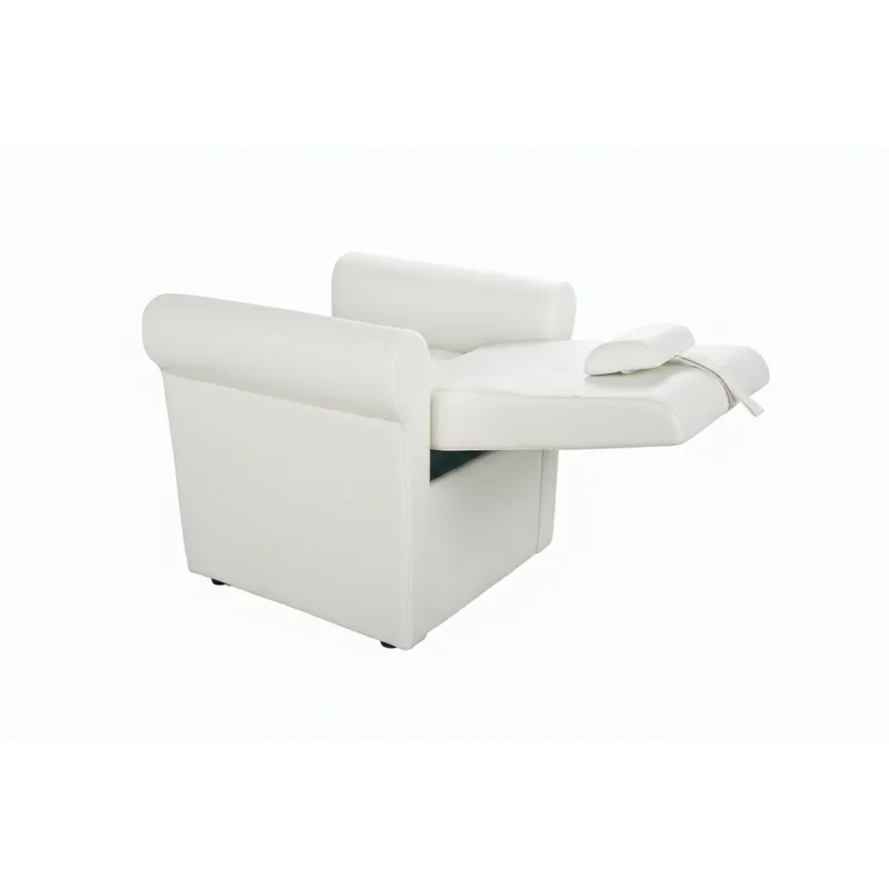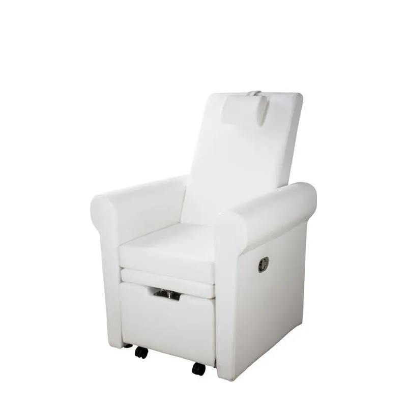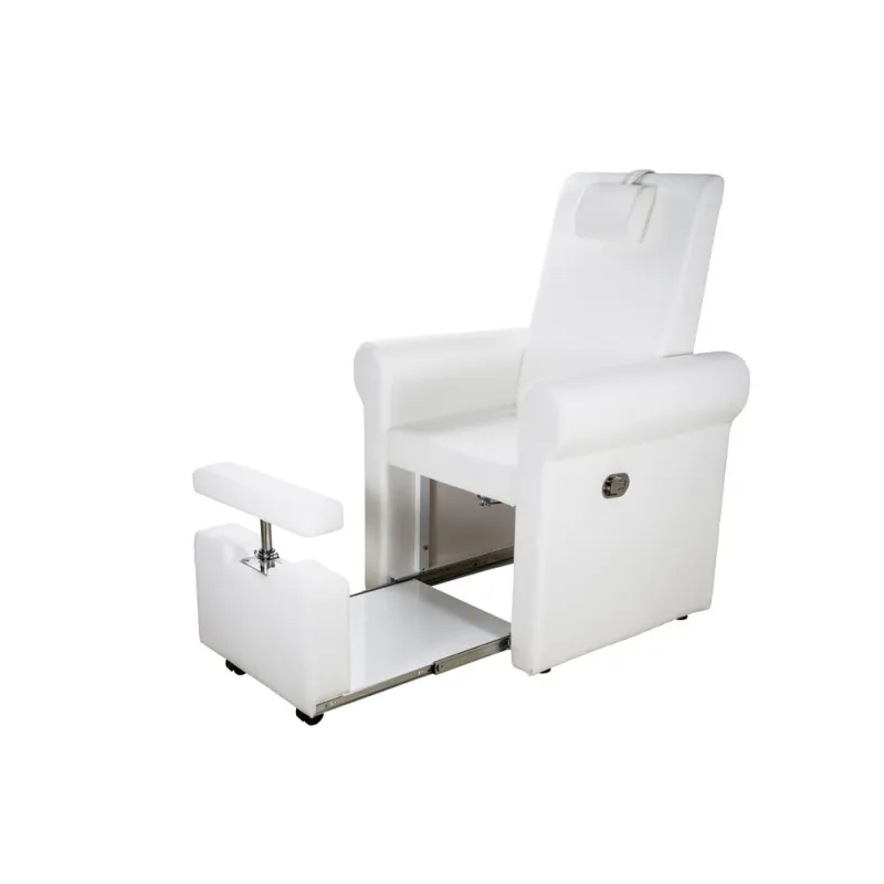 Poltrona pedicure spa dal design comodo ed elegante, con rivestimento in PU bianco di alta qualità. L’inclinazione dello schienale è regolata da un pistone a gas. Dotata di vano estraibile sotto la seduta per l’inserimento di una bacinella per pedicure. Poggiapiedi regolabile.