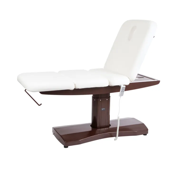 Lettino multifunzionale dalle alte prestazioni dotato di 3 motori che regolano l’altezza, l’inclinazione dello schienale e il segmento centrale. Foro facciale e cuscino poggiatesta. Struttura metallica color marrone. Rivestimento bianco in PU di grande qualità e facile da pulire.