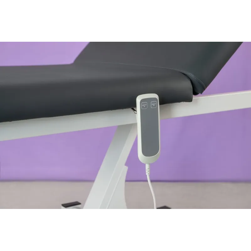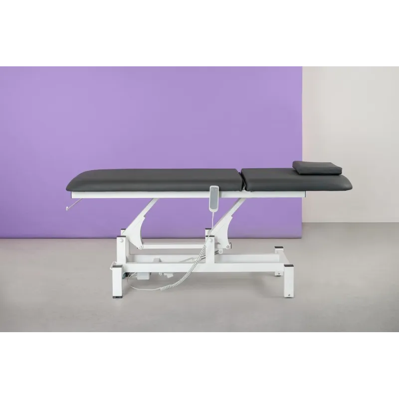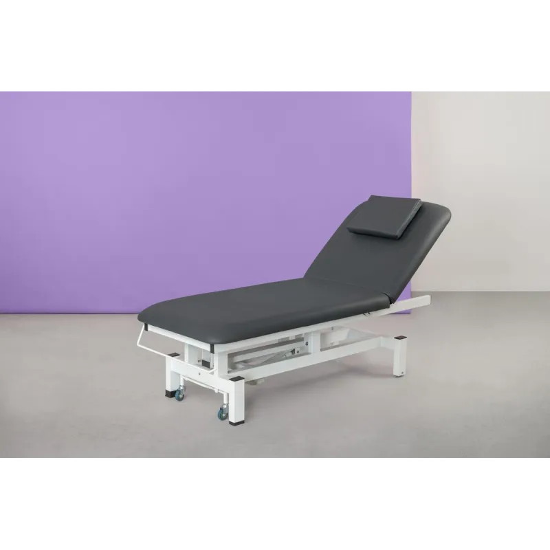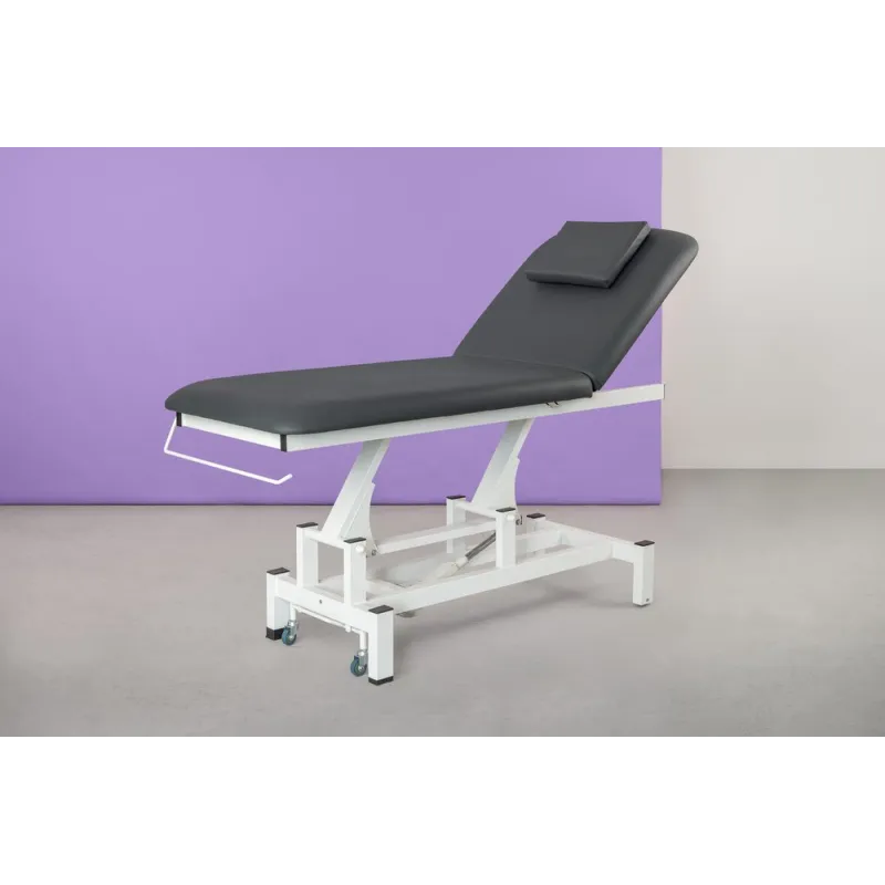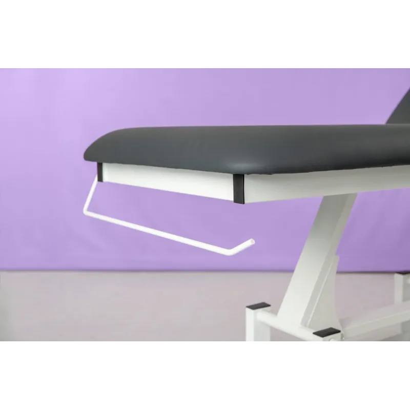 Lettino a 2 sezioni con struttura metallica molto stabile. Dotato di 1 motore per regolare l’altezza tramite telecomando manuale. Schienale regolabile tramite pistone a gas. Cuscino poggiatesta removibile con foro facciale. Ruote a scomparsa su un’estremità per facilitarne lo spostamento. Disponibile in bianco e grigio. Portarotolo incluso.