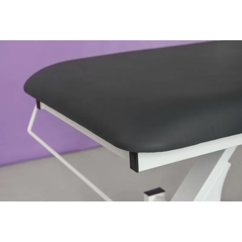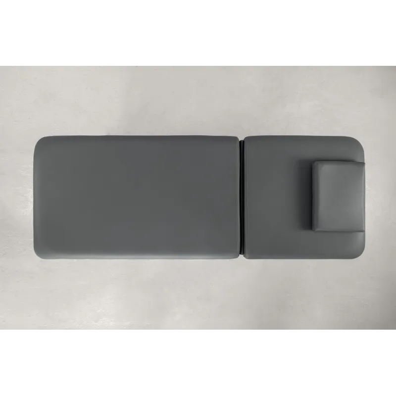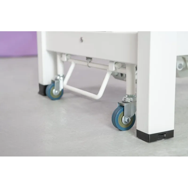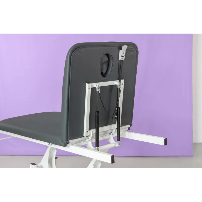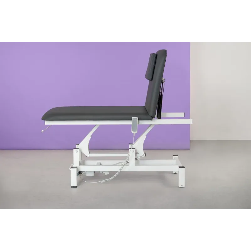 Lettino a 2 sezioni con struttura metallica molto stabile. Dotato di 1 motore per regolare l’altezza tramite telecomando manuale. Schienale regolabile tramite pistone a gas. Cuscino poggiatesta removibile con foro facciale. Ruote a scomparsa su un’estremità per facilitarne lo spostamento. Disponibile in bianco e grigio. Portarotolo incluso.