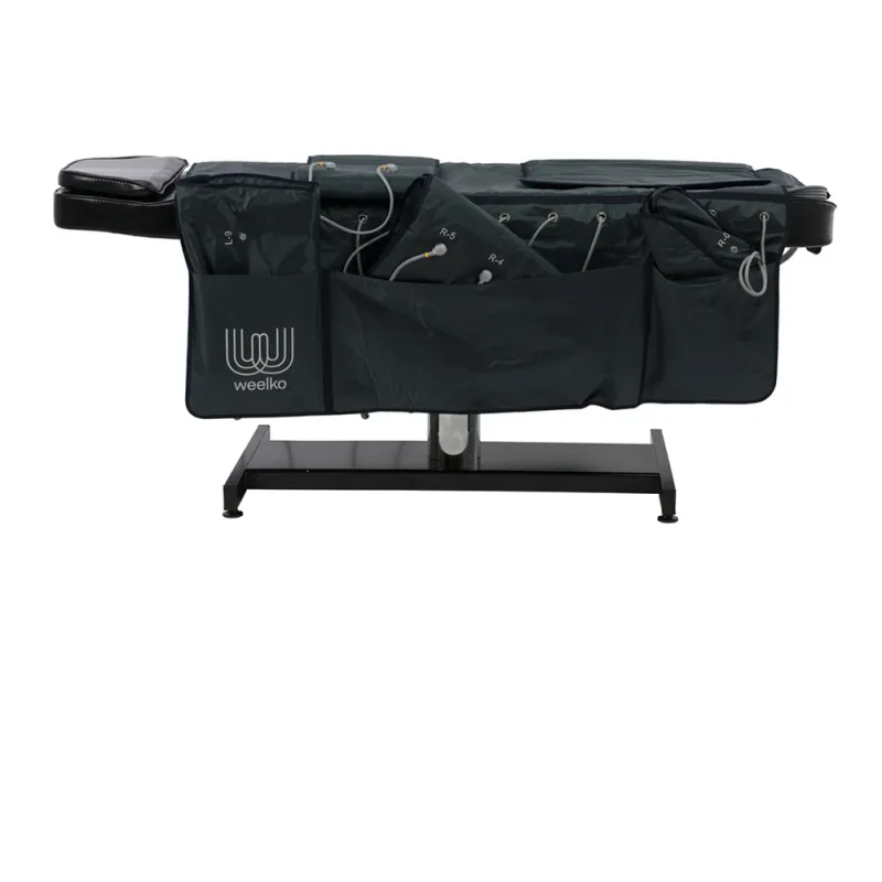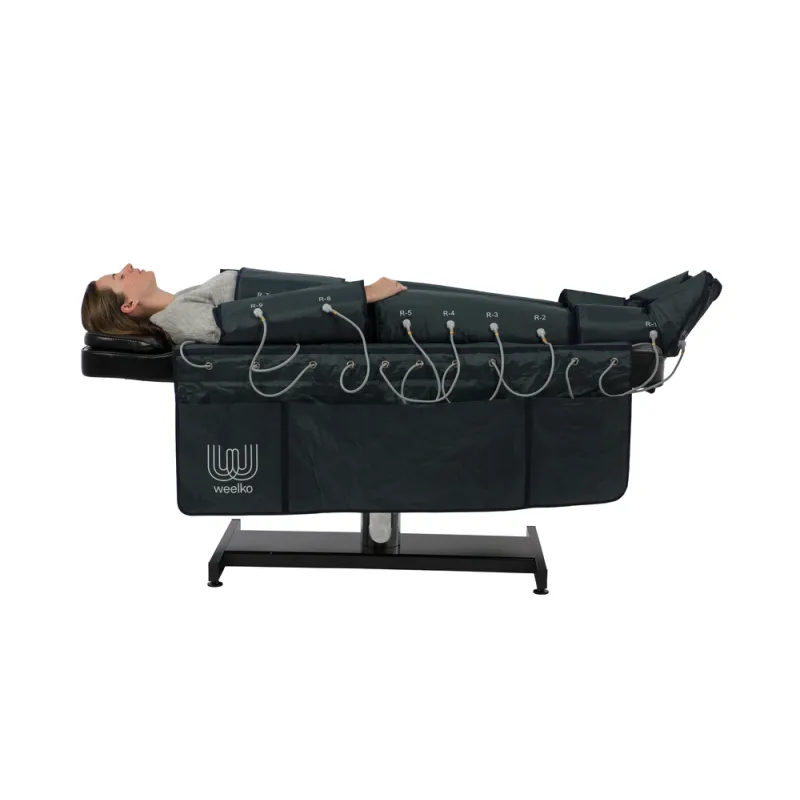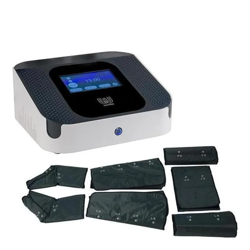 Dispositivo digitale per pressoterapia con schermo touch e 4 programmi di lavoro. La tuta è composta da stivali, gambe, fascia addominale e braccia, e include anche una coperta per riporre i cavi. Ideale per migliorare la circolazione e facilitare l’eliminazione dei grassi attraverso l’attivazione del drenaggio linfatico.