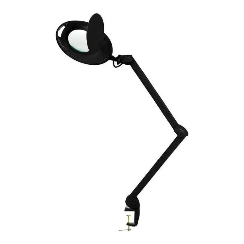 Lampada LED a luce fredda con lente d’ingrandimento 5x. Dotata di braccio articolato e morsetto per fissaggio su tavoli o carrelli estetici. Disponibile anche con sistema di fissaggio a parete.